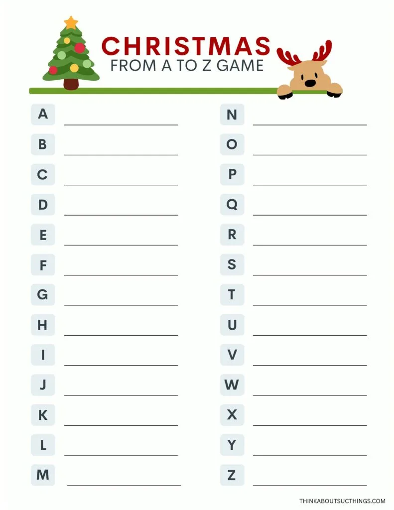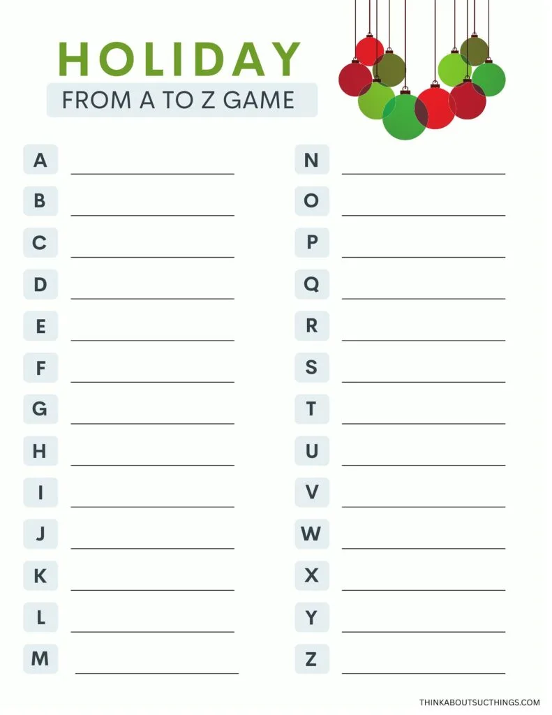 How to Play: Give everyone a piece of paper and a pen. The goal is to write down a Christmas-themed word for every letter of the alphabet (A for Angel, B for Bells, C for Carol, etc.). Give them about three minutes to fill out their list. When time is up, go around the room and have people share some of their more creative answers.